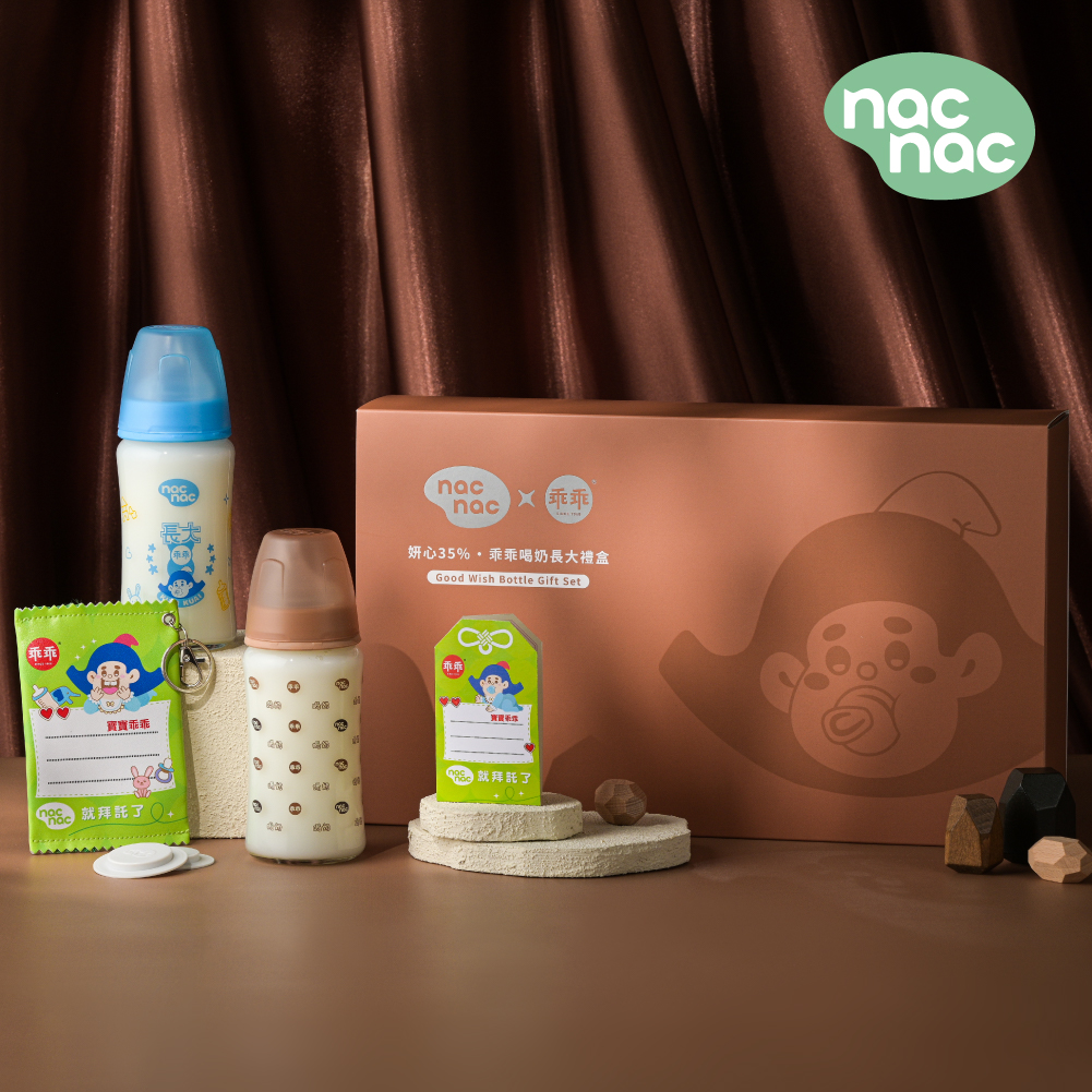 以「一瓶承載台灣人集體記憶的祝福奶瓶」為靈感,親子品牌 nac nac 攜手台灣經典品牌 乖乖,推出限量聯名「祝福奶瓶禮盒」。這款結合「科學」與「玄學」雙重守護概念的聯名新品,將乖乖的好運能量注入奶瓶中,用最可愛的方式守護每一位寶寶「乖乖喝奶、乖乖長大」。