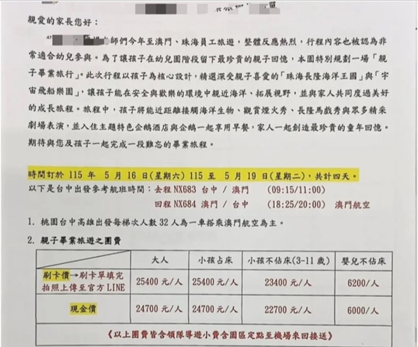 該幼兒園家長收到畢旅通知單指出,老師們今年至澳門、珠海員工旅遊,整體反應熱烈,行程內容非常適合幼兒參與,為了讓孩子在幼兒園階段留下最珍貴的親子回憶,園方規劃明年5月16日至19日舉辦4天3夜澳門、珠海「親子畢業旅行」,費用一人約兩萬三至兩萬五千多元。