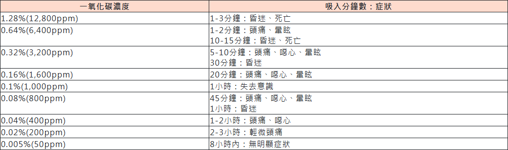 根據內政部消防署的資料顯示,空氣中一氧化碳濃度對人體的影響,大約200ppm,持續吸入2~3小時,會導致頭痛,等到濃度到達800ppm時,一小時內就會陷入昏迷,若濃度在升高,短短幾分鐘就可能致命,如下表所示: