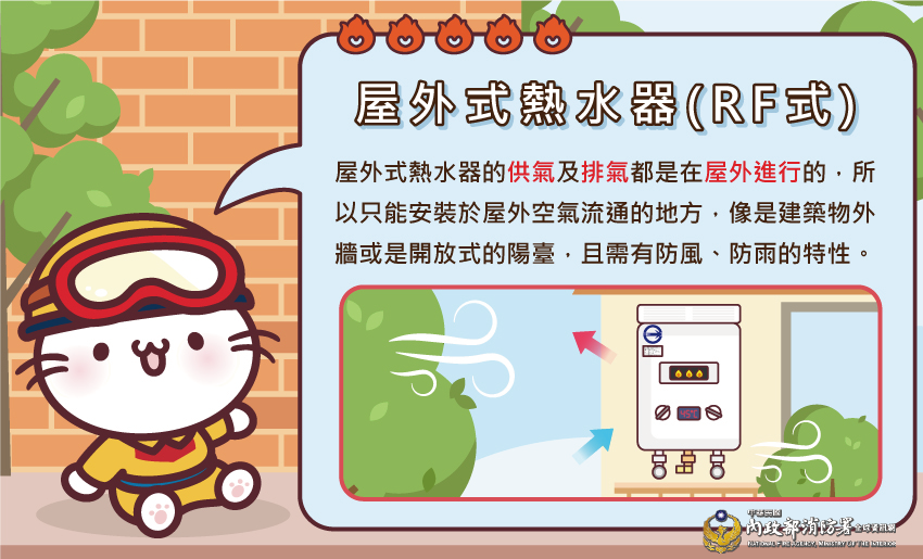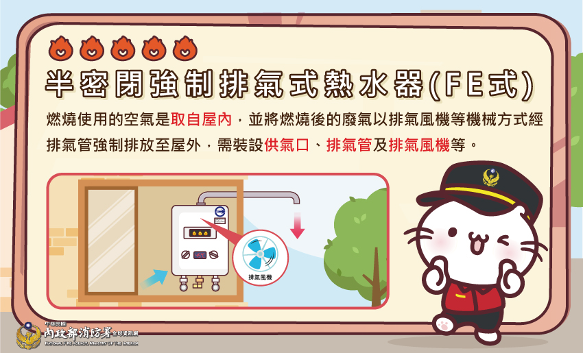 如果家中熱水器安裝在室內,或是裝在有窗戶、有遮雨棚的半密閉陽台,依法規必須安裝「強制排氣型(FE式)」熱水器。
